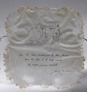 Paul eluard (1895-1952) : Le Visage De La Paix. Encre sur peau, signée en bas à droite et accompagnée de trois vers manuscrits extraits de son poème Le Visage de la Paix, dans un emboîtage en plexiglas. 55 x 48 cm.