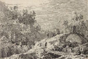 Antonio canaletto (1697 - 1768) : Le Paysage de montagne avec cinq ponts. (Bromberg22 iief). 14,1 x 20,6 cm. Eau-forte. Très belle épreuve coupée au cuivre, tache au verso.
