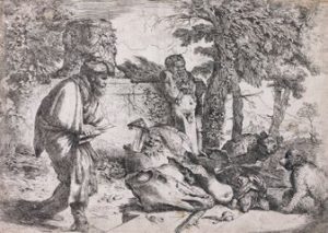 Giovanni Benedetto castiglione (1609 - 1664) : L’Invention des corps de Saint Pierre et de Saint Paul - Le Philosophe Diogène cherchant un homme. (Bartsch 14,21).29,5 x 20 cm. 21,7 x 30,2 cm. Eau-forte. Belles épreuves légèrement jaunies avec...