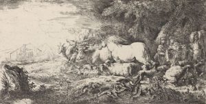 Giovanni Benedetto castiglione (1609 - 1664) : L’entrée dans l’arche. (Bartsch 1). 20,2 x 40 cm. Eau-forte, très belle épreuve, infimes amincissures, petites marges.