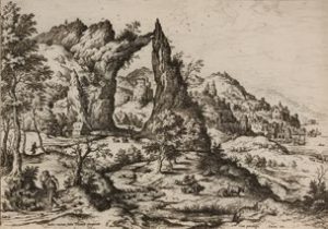 Jérôme Cock (1518 - 1578) : Judas et Thamar. Planche 2 d’une série de treize paysages avec scènes bibliques ou mythologiques. (H. 9). 22,5 x 32,5cm. Eau-forte, très belle épreuve coupée sur le bord droit, légers plis ondulés. Filet de marge