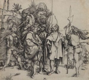 Albrecht dürer (1471 - 1528) : Les cinq soldats et un cavalier oriental sur un cheval. (Hollstein, Meder 81 ; Bartsch 88 ; Strauss 6). 130 x 143 cm. Burin. Très belle épreuve légèrement incomplète de quelques millimètres, tirage courant...