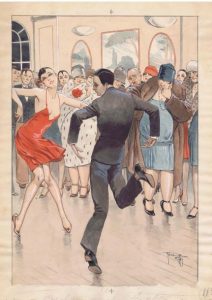 René GIFFEY. (1884-1965) C’est la danse nouvelle.Gouache couleurs sur papier, format 28 x 42 cm. Légende manuscrite à la mine de plomb. Dessin publié dans Fantasio, années 20. Signé en bas à droite.