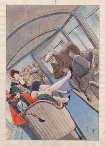 René GIFFEY. (1884-1965) Voyage à sensation, le pilote fait le looping.Gouache couleurs sur papier, format 28 x 42 cm. Légende manuscrite à la mine de plomb. Dessin publié dans Fantasio n°822, années 20. Signé en bas à droite.