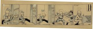 André DAIX (1901-1976) Le Professeur Nimbus. Chez le dentiste.Encre de Chine et crayon bleu pour une bande numérotée 1938. Format 50 x 15,5 cm. Signée.