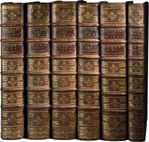 6 vol. in-folio, manquent les titres des t. I et V, bas. fauve marbrée de l’ép., dos à nerfs ornés, p. de t. et de tom. de mar. grenat. Tomes : I. 1674-1699 -- II. 1700-1713 -- III. 1714-1745 -- IV. 1746-1775 -- [V. Recueil des Édits, Déclarations enregistrés en la Chambre des Comptes Cour des Aides ... à Dole... ] -- VI. Table alphabétique des T. 1 à 4.