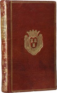 2 tomes en un vol. in-12, (1) f., 142 pp. ; (2) ff., 197 pp., mar. rouge de l’ép., dos lisse orné, p. de t. et de tom. de mar. vert, triple fil. dor. sur les plats, armoiries au centre, tranches dor. Aux armes de la marquise de Pompadour (O-H-R pl. 2399, fer n°4). Ex-libris Bibliothèque du Docteur Lucien-Graux .