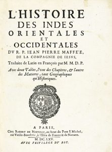 MAFFEI, G. Pietro - L’Histoire des Indes orientales et occidentales, traduite de latin en françois par M. M. D. P. Avec deux tables, l’une des chapitres et l’autre des matières, tant géographiques qu’historiques. Paris, Robert de Ninville,...