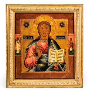 Icône. Le Christ bénissant. Russie, XIXe siècle. Tempera sur bois (44 x cm 39 cm) ; dans cadre en bois doré. Икона "Господь Вседержитель". Россия, XIXв. Дерево, темпера, 44 х 39 см. В...