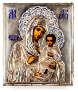 Icône Notre-Dame de Tikhvin. Moscou. 1908-1917. Tempera sur bois. 31 x 26 cm. Velours ; oklad et riza d’argent et de vermeil ; auréoles en vermeil et émaux cloisonnés. ◊ MO : ME ◊ ∆ K -> 84 ◊ K -> ◊ Importation : cygne...