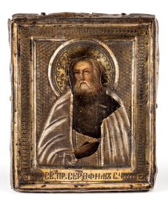 Icône. Saint Séraphim de Sarov. Moscou, 1896-1908. Tempera sur bois, 7 x 5,5 cm. Okklad en argent et vermeil. ◊ MO : AC ◊ Titre : 84 <—K joint : une croix en or 56 (maître-orfèvre КГЧ) ; une croix en argent 84 ; une médaille en argent...