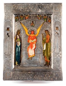 Icône. La sainte sagesse de la Parole divine, entourée de Marie mère de Dieu et de saint Jean le Baptiste. Russie, XIXe siècle. Tempera sur bois, 16,5 x 12,5 cm. Oklad en argent ciselé. ◊ titre 84, <—K ◊ MO : ОГ Quelques manques de...