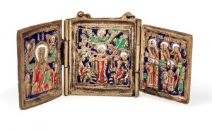 Icône triptyque de voyage. Russie, XIXe siècle. Bronze émaillé. 5 x 14 cm. Складень. Россия, XIXв. Бронза, эмаль, 5 х 14 см.