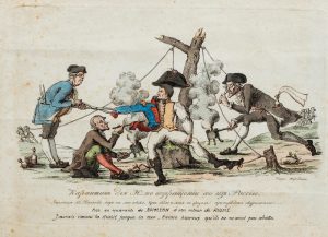 Ivan Ivanovitch Terebenev (1780-1815). Mise en Quarante de Napoleon a son retour de Russie. Russie, 1813. Gravure rehaussée à l’aquarelle. Signature gravée. 24,5 x 34,5 cm à la vue. Dans cadre vitré. Sous la légende en russe, figure la...