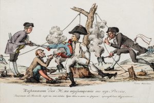 Иван Теребенев. Карикатура "Карантин для Н... по возвращении его из России". Россия, 1813.