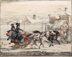 Ivan Beggrov, d’après Alexandre Orlovsky (1777-1832. La troika passant devant la guérite. Saint Pétersbourg, 1820. Lithographie couleurs (44,5 x 56,5 cm). Daté 1820 dans la lithographie. Иван Беггров. У городской...
