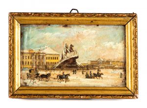 Ecole Russe vers 1830. Vue du monument à Pierre le Grand à Saint Pétersbourg. Gouache sur traits gravés. 5,5 x 9,5 cm à la vue. Русская школа. Вид Сенатской пощади в Санкт-Петербурге....