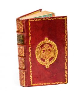 Том in-12, в красном марокеновом переплете, золотой бордюр обрамляет крышки, золотой тисненый герб в центре каждой крышки, корешок с бинтами, золотым орнаментом и вставкой из зеленой кожи с тисненым золотым названием, форзацы из мраморной бумаги, золотой обрез.