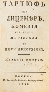 Жан-Батист Покелен, именуемый Мольер. Тартюф или Лицемер, Комедия из Театра Молиерова в Пяти Действиях. Москва, Компания Типографическая, 1788.