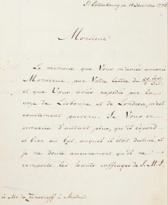 Comte Ivan Andreievich d’Osterman. Lettre signée, au Mr de Zinovieff, à Madrid. Saint-Pétersbourg, 18 décembre 1778. Deux pages in-4°, écrites à l’encre noire ; en français. Il l’informe que son mémoire, expédié par la voie de...