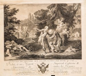 C. Macret, d’après L. Fauvel. Réception de Voltaire aux Champs Elysées par Henri Quatre. Paris, l’Auteur, vers 1780. Aquaforte & burin sur feuille (32 x 37 cm). Signé dans la gravure. Aigle impériale au centre de la légende. « Dédié à...