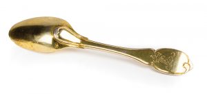 Cuillère à thé, en vermeil, au chiffre couronné de l’impératrice Catherine II. [1770]. 14,6 cm. Dans un étui de maroquin brun semé de fleurs de lys estampées à froid. Provenance : prince de Monaco. Ложка чайная. Из...