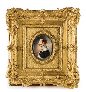 Ecole Russe du XIXème s. Portrait du Grand-Duc Mikhaïl Pavlovitch. Miniature sur ivoire. Ovale, 5 x 4 cm. Dans un cadre en bois doré. Русская школа. Портрет великого князя Михаила Павловича...