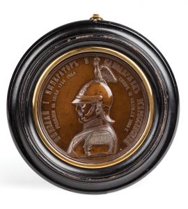 Pavel Brousnitsine (Brusnitsin). Médaille commémorative pour le monument de Nicolas 1er érigé à Saint Pétersbourg. Saint Pétersbourg, 1859. Bronze. Diamètre 8,7 cm. Dans un cerclage de laiton ; dans un cadre de bois noir. Inscriptions en...