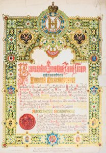 I. P. Petrov-Ronet. Annonce du couronnement de l’empereur Nicolas II & de l’impératrice. Moscou, Levenson, 1896. Lithographie couleurs, contrecollée sur carton. 40 x 27,8 cm. Manque à la marge droite et au coin...