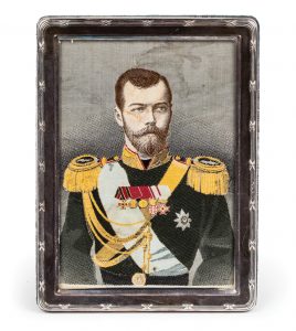 Portrait de l’empereur Nicolas II en uniforme. Russie, vers 1900. Soie tissée, 13 x 9,5 cm ; dans cadre vitré. Provenance : famille Pouchkine. Портрет императора Николая II. Россия, нач. XXв. Шелк,...