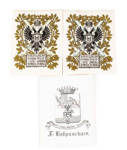 • Два экс-либриса библиотеки Николая II в Зимнем дворце, по рисунку барона Арминия фон Фелькерзама, хранителя галереи драгоценностей в Эрмитаже. Санкт-Петербург, 1907.