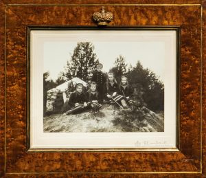 Au centre, debout au sommet d’un monticule de terre, le Tsarévitch est vêtu du caban et du bachi du Standard ; il est entouré de ses quatre sœurs Marie, Anastasie, Ogla & Tatiana, assises, elles aussi en tenue de marin.