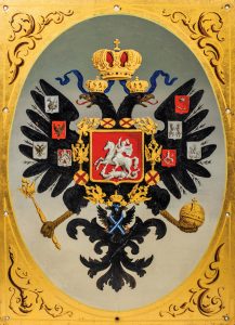 Plaque métallique, peinte aux grandes armes de l’Empire russe. XIXème siècle. Métal (51 x 41 cm). Probablement, une plaque destinée à être apposée sur la façade d’une ambassade ou d’un bâtiment officiel. Вывеска с...