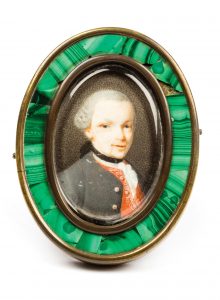 Ecole russe. Portrait d’un gentilhomme. Saint Pétersbourg, fin du XVIIIème siècle. Miniature sur ivoire oval (7 x 5 cm à la vue); dans un cadre de mosaïque de malachite à cerclages de bronze (cadre de la manufacture de bronze et de taillerie...