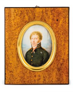 exécution très fine. Cet aristocrate est vêtu de l’uniforme vert sombre aux boutons à la croix de l’Ordre, qu’Alexandre Ier avait assigné aux chevaliers de l’Ordre dont il était le protecteur. En plus de la croix de l’Ordre appendue à un ruban noir, ce gentilhomme russe porte autour du cou le ruban d’où pend la croix de Sainte-Anne. En 1817, Alexandre Ier prohiba le port de cet uniforme, n’autorisant le port de la seule décoration qu’à ceux qui l’avaient reçue à titre millitaire.