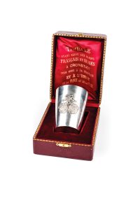 Timbale en métal argenté, à l’effigie de la paix et aux armes de Russie & de Paris. France ou Russie, 1891. Métal argenté. 10 x 8 cm. Dans un écrin de maroquin bordeaux doublé de soie et de velours, et portant l’inscription en lettres...