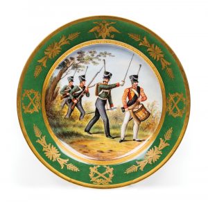 Assiette à thème militaire (infanterie). Saint-Pétersbourg, Manufacture impériale de porcelaine, vers 1820-1825.