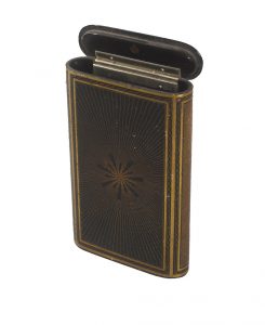 Etui à cigares, à vaste décor rayonnant doré. Russie, vers 1910-1915. Matériau synthétique (bakélite ?). 12,5 x 7,5 x 2 cm. Aigle impériale au revers du couvercle. Коробка для папирос. Россия, ок.1915. Бакелит...