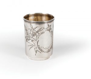 Verre à vodka. Moscou, 1896-1908. Argent ciselé, 6 x 4,5 cm. Poids : 37,68 g. ◊ MO : ВФ ◊ 84, <—K, НЛ (Ivan Liebedkine) Rond de serviette à décor floral. Moscou, 1908-1917. Argent et vermeil. Poids : 39,39 g. ◊ MO : СФ ◊ ∆,...