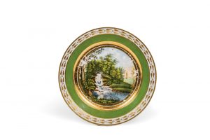 D’après Sylvestre Schedrine. Assiette au paysage de Pavlovsk. Saint Pétersbourg, Manufacture impériale de porcelaine, vers 1820. Porcelaine blanche peinte et dorée. Diamètre 23,6 cm. Dans un entour doré, vaste paysage du parc de Pavlovsk;...