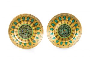 Deux assiettes provenant du service pour les banquets du Kremlin. Saint Pétersbourg, Manufacture impériale de porcelaine, 1837 - 1838. Porcelaine blanche, peinte & dorée. Diamètre 24 cm. Au dos, marque au chiffre de Nicolas 1er. Riche décor...