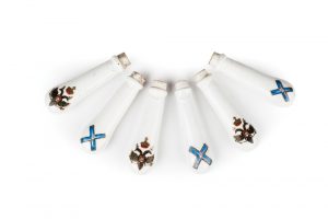Six manches de couteau en porcelaine blanche, présentant l’aigle impériale d’un côté et la croix de saint André de l’autre. Russie, XVIIIème - XIXème siècles. 9,5 cm. Шесть рукоятей от ножей с...