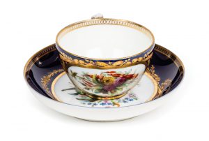 Tasse et soucoupe. Saint Pétersbourg, Manufacture impériale de porcelaine, vers 1830. Porcelaine peinte et dorée. Tasse : 8,2 x 5 cm. Soucoupe : diamètre 13,7 cm. Marque « НI » couronné. Чашка и блюдце....