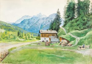 Au dos, signature et six lignes au crayon de la main du peintre : « Environs de Alttoblach (Dobbiaco depuis 1918) / 1937 / (l’hotellerie où l’on dansait et où se trouveraient des tableaux de Deffregger) ».