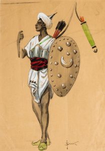Serge Solomko. Projet pour le costume d’un archer abyssin de l’armée ottomane. Aquarelle sur traits de crayon, rehauts de gouache ; sur feuille (27 x 19 cm à la vue). Signé à l’aquarelle en bas au centre-droit. Сергей...