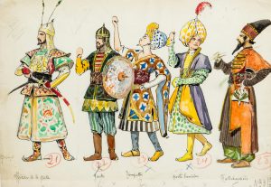 Serge Solomko. Projet pour le costume de cinq personnages de la cour ottomane : officier de la garde, gardes, trompettes, porte-bannière et hallebardiers. Aquarelle sur traits de crayon, rehauts de gouache ; sur feuille (23 x 32 cm à la...