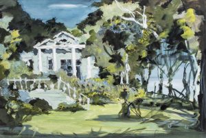 Dimitri Bouchène (1893-1993). Projet pour décor de théâtre : un manoir russe à la campagne. Gouache sur papier. 34 x 50 cm. Dans cadre vitré. Signé en bas à droite. Дмитрий Бушен (1893-1993). Вид усадьбы. Бумага...
