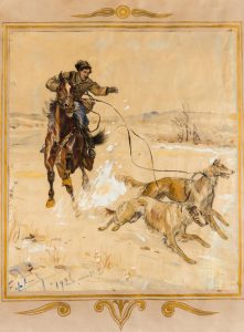 Efremov. Le chasseur à cheval, précédé de ses deux lévriers. 1926. Aquarelle, 46 x 40 cm, signé et daté (31 janvier 1926) en bas à gauche; dans un cadre vitré. Provenance : colonel Silvester Constantinovitch Gourieff, en émigration en...