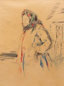Philippe Andreevitch Maliavine (1869 - 1940). Femme chaudement vêtue, devant son isba. Crayons de couleur sur papier. 34,5 x 25,5 cm à la vue. Sous passe-partout et cadre vitré. Signé en cyrilliques, au milieu-bas à gauche. Филипп...