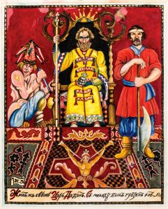 Nicolas Artamonov. Illustration pour le Coq d’or d’Alexandre Pouchkine, page de titre : « Conte du Coq d’or ».